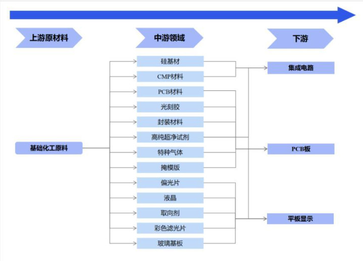 电子化学品.上游原材料是基础化工原料,包括烷烃及其衍生物、烯烃及其衍生物、醌类、醛类、醇类、无机酸、无机碱、无机盐以及工业气体等;中游是集成电路电子化学品(如硅基材、CMP材料、光刻胶、超净高纯试剂等)、PCB电子化学品(如水平沉铜专用化学品、化学镍金专用化学品、电镀铜专用化学品、蚀刻液和油墨等)、平板显示电子化学品(如液晶、取向剂、PI膜等)及其他电子化学品(如电子零器件、动力电池等表面防腐、抗磁等专用化学品)的制造;下游应用领域可分为集成电路、PCB板、平板等。相关龙头企业包括光华科技、上海新阳、景瑞电材、江化微、强力新材、新宙邦、金宏气体、飞凯材料、昊华科技、雅克科技、福斯特、隆基绿能、TCL中环、沪硅产业等。