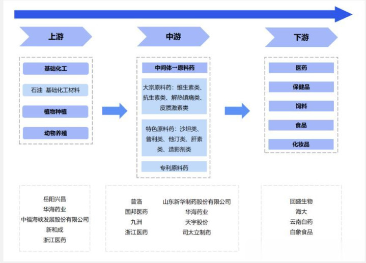 医药原药.原料药产业链上游为原材料,主要包括基础化工、植物种植和动物养殖;中游为中间体/原料药的加工制造,主要包括大宗原料药、特色原料药和专利原料药;下游为应用市场,主要包括医药、保健品、饲料、食品、化妆品等领域。