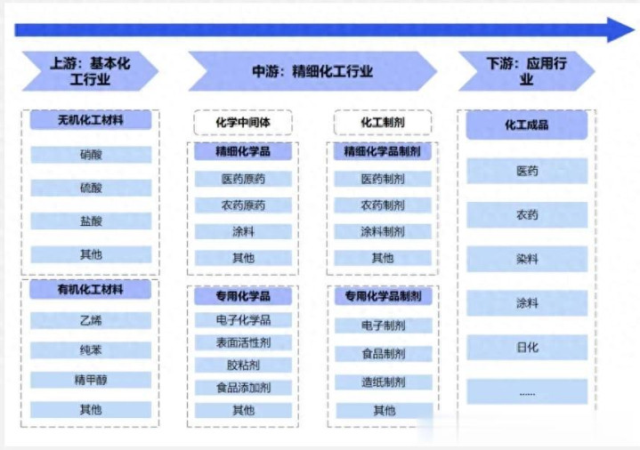精细化工行业的上游产业主要是基础化工行业,包含无机化工原料和有机化工原料;中游包含化学中间体和化工制剂两大细分领域,前者包含精细化学品和专用化学品,后者包含精细化学品制剂和专用化学品制剂;下游应用场景主要包含医药、农药、染料和日化等应用市场。