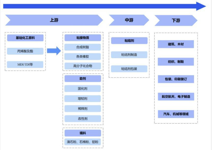 胶粘剂.上游行业主要是基础化工原料制造商,化工原材料包括有机硅、合成树脂、丙烯酸及丙烯酸酯、MDI、TDI、溶剂油、助剂及单体等。下游应用领域极为广泛,包括建筑、建材、纺织、制鞋、包装、印刷装订、航空航天、电子制造、汽车、机械、体育用品等领域。
