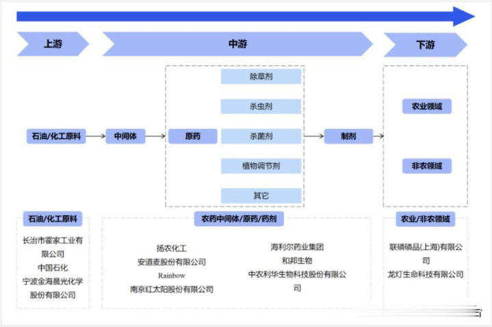 农药.产业链的上游主要为苯、烯烃、醇、酯类等化工原料,通过合成加工成为中游的农药中间体、农药原药,最终生成不同配比的制剂,终端应用于下游的农林牧渔业生产和公共卫生等领域。