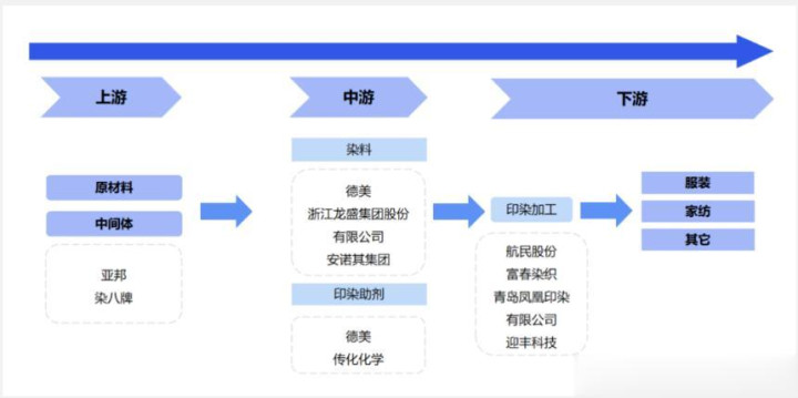 染料颜料.上游主要为原材料、中间体生产企业。中游为染料和印染助剂生产制造企业,主要分类有分散染料、活性染料等。下游主要为印染加工并最终流向服装、家纺等企业。