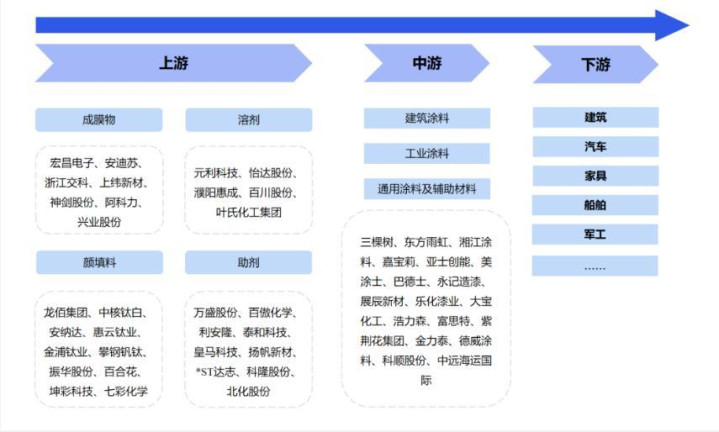 涂料.上游是原材料市场,主要由涂料制造所需的四类原材料构成,包括以树脂为主的成膜物、颜填料、溶剂和助剂;中游是涂料生产制造;下游是产品需求市场,主要应用于建筑、汽车、船舶、家具等行业。目前,我国涂料行业企业众多,市场集中度低,竞争激烈。