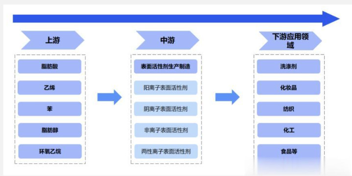 表面活性剂.可分为阳离子表面活性剂、阴离子表面活性剂、两性离子表面活性剂及非离子表面活性剂。产业链上游主要为脂肪酸、乙烯、苯、脂肪醇、环氧乙烷等原材料;中游为表面活性剂生产供应环节,主要包括离子和非离子表面活性剂;下游主要应用于洗涤剂、化妆品、纺织、化工、食品等领域。重点企业包括赞宇科技、丽臣实业等。